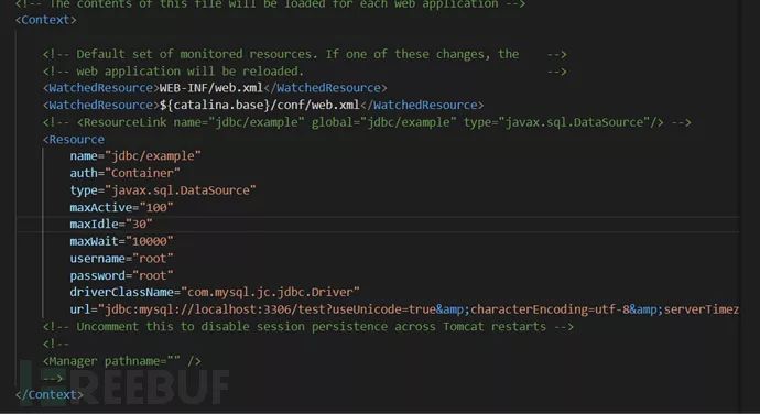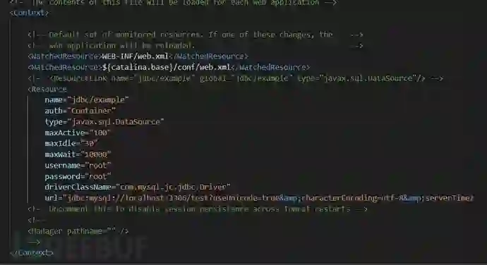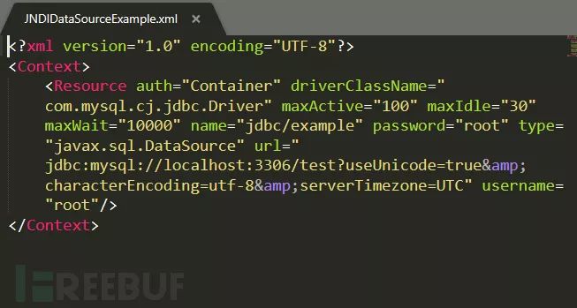 <Resource auth="Container" driverClassName="com.mysql.cj.jdbc.Driver" maxActive="100" maxIdle="30" maxWait="10000" name="jdbc/example" password="root" type="javax.sql.DataSource" url="jdbc:mysql://localhost:3306/test?useUnicode=true&characterEncoding=utf-8&serverTimezone=UTC" username="root"/>