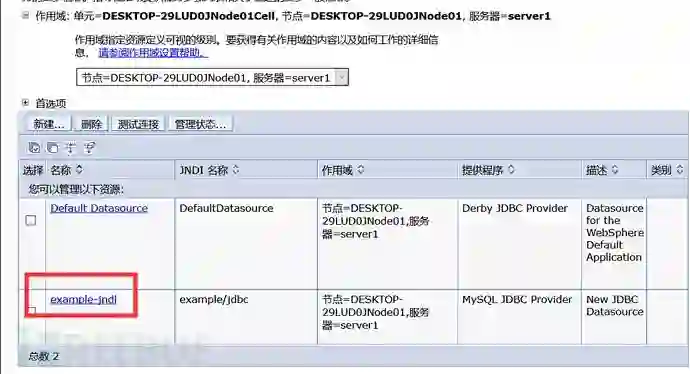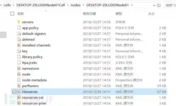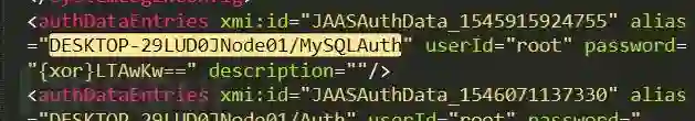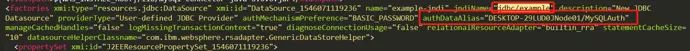4)那么根据配置的作用域打开对应的resources.xml就可以了,然后在文件中搜索我们的jndi名称。我上面2.3的配置是设置在节点作用域下,故打开节点作用域的resources.xml。这里离目标更近一步了,我们获得了authDataAlias和数据库连接地址,接下来是找到真实的认证信息。