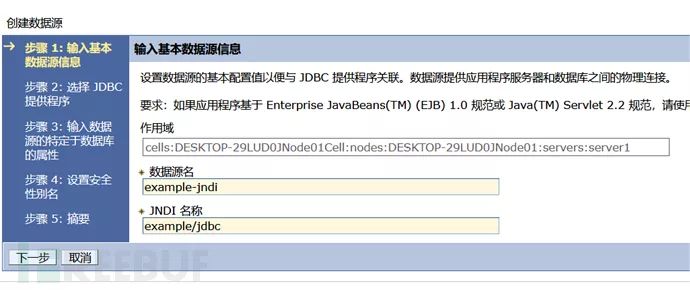 7)配置数据源名和JNDI名称,重点是JNDI名称,需要与应用中引用的一致。