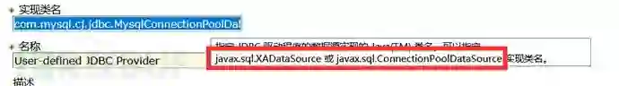 3)配置实现类名,这里就要到mysql的jdbc包中去找了,找含有名称DataSource或ConnectionPoolDataSource的类文件。其他的则是描述性质字段可自便。完整内容截图看下图第二张即可。