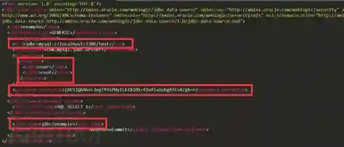 2)根据WebLogic控制台中配置的名称,在此处就会保存为对应名称的配置文件。上面配置案例是”example-jdbc”,所以文件名也就是example-jdbc.xml。打开配置文件查看配置内容,配置中包含数据库连接、数据库用户名、加密后的口令、JNDI名称。
