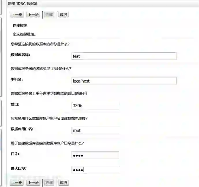 4)后续的一些配置截图参考,可采用默认设置。当然,数据库名称、主机名、端口、数据库用户名、口令这个肯定要和需要被连接的数据库一致。