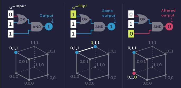 输入字符串0,1,1的简单布尔功能可对应到下图立方体的一角,如果翻转第一个字符,我们可以发现对“OR”“AND”(或与)电路的输出没有什么影响,相反,如果你翻转第三位,对于这个操作来说,输出是敏感的,标记为红色。