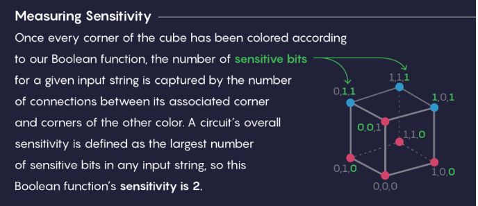 先从“灵敏度”谈起,“灵敏度”是一种度量,捕获输入字符串中的信息如何影响输出位改变,换句话说,布尔函数的“灵敏度”跟踪翻转单个输入位改变输出位的可能性。