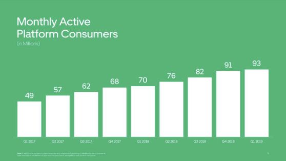 (Uber在2019Q1盈利报告中对每月活跃用户的展示)