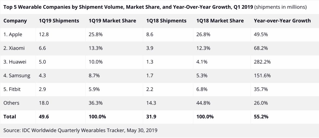 2019年第一季度可穿戴设备增长强劲,华为增幅亮眼