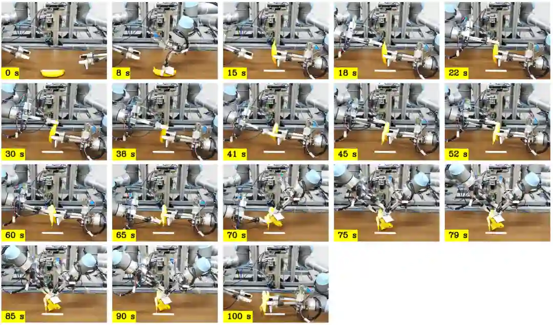 一位研究人员操作机器人剥了数百根香蕉皮,生成了811分钟的演示数据,来训练机器人自己去做这件事,这项任务被分为9个阶段,从抓住香蕉到用一只手把它从桌子上拿起来,用另一只手抓住顶端,剥香蕉皮,然后移动香蕉,这样剩下的皮就可以被剥掉了: