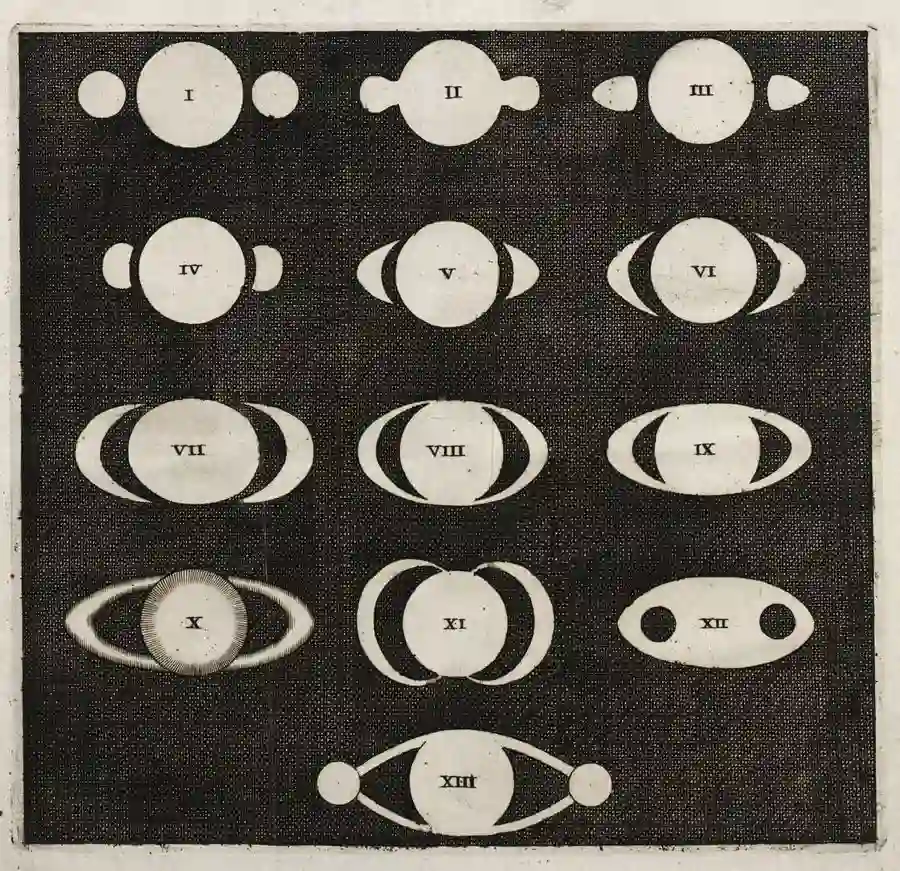 在接下来的四十多年的时间里,土星与土星环在早期天文望远镜的注视下不断地变化形态(图2),让当时的天文学家十分不解。直到1656年,惠更斯(Christiaan Huygens)提出大家看到的景象是因为土星的周围存在着一个扁平的薄环,并与地球观察者不断地变化着角度。