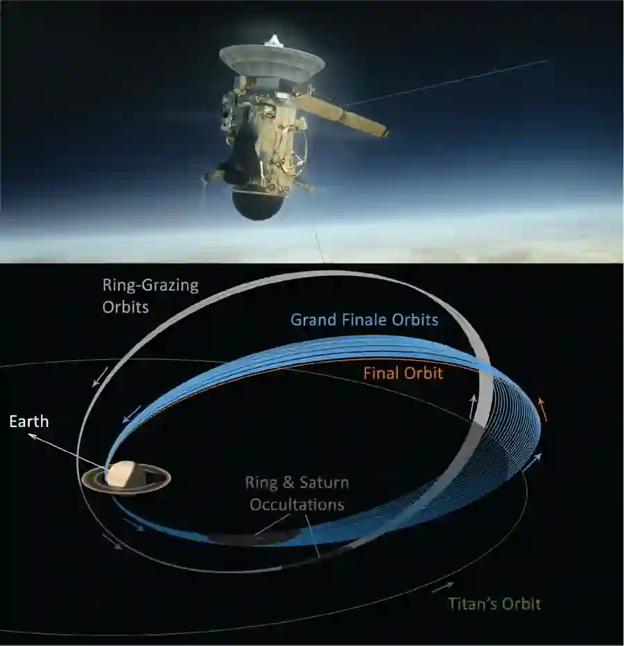 图3. 卡西尼飞船与其最后一年的轨道(图源:NASA/JPL-Caltech)