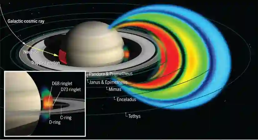 图6. 土星系统中的高能粒子辐射带(图源:Roussos 2018, Science 362, Issue 6410, eaat1962)