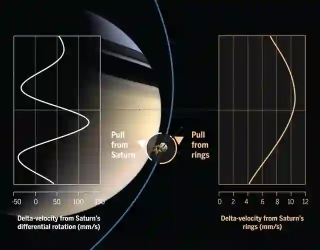 图7. 通过测量卡西尼飞船轨迹的微小扰动来计算土星环的质量(图源:Iess et al. 2019 Science 364, 6445, eaat2965)