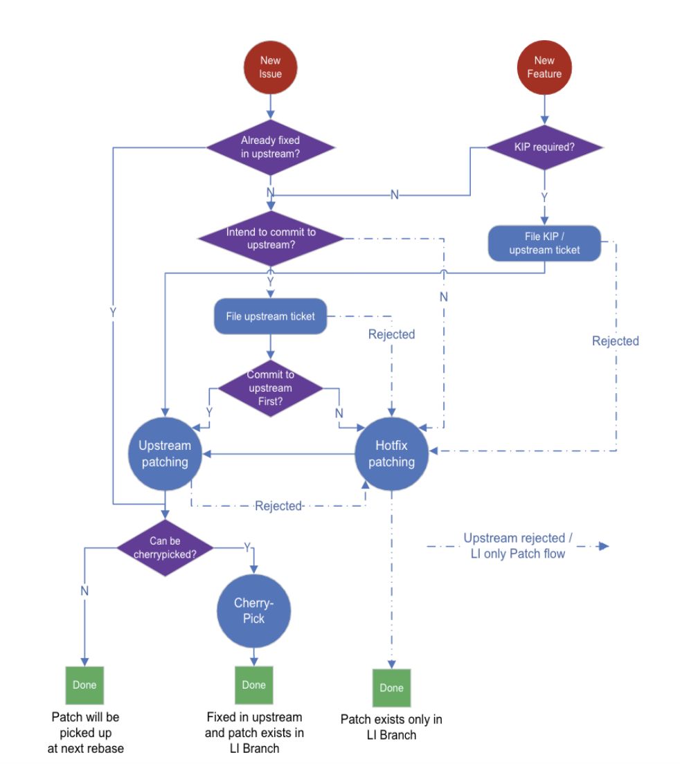因为先提交到上游再加入 LinkedIn 版本分支会让发布时间变得更长,所以一般适合低优先级或中等优先级的版本。