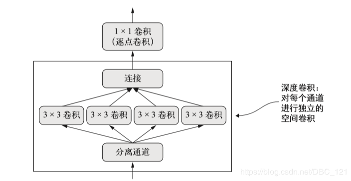 如果我告诉你,有一个层可以替代 Conv2D,并可以让模型更加轻量(即更少的可训练权 重参数)、速度更快(即更少的浮点数运算),还可以让任务性能提高几个百分点,你觉得怎么样?我说的正是深度可分离卷积(depthwise separable convolution)层(SeparableConv2D)的作用。这个层对输入的每个通道分别执行空间卷积,然后通过逐点卷积(1×1 卷积)将输出通道混合,如下图。这相当于将空间特征学习和通道特征学习分开,如果你假设输入的 空间位置高度相关,但不同的通道之间相对独立,那么这么做是很有意义的。它需要的参数要少很多,计算量也更小,因此可以得到更小、更快的模型。因为它是一种执行卷积更高效的方法, 所以往往能够使用更少的数据学到更好的表示,从而得到性能更好的模型。