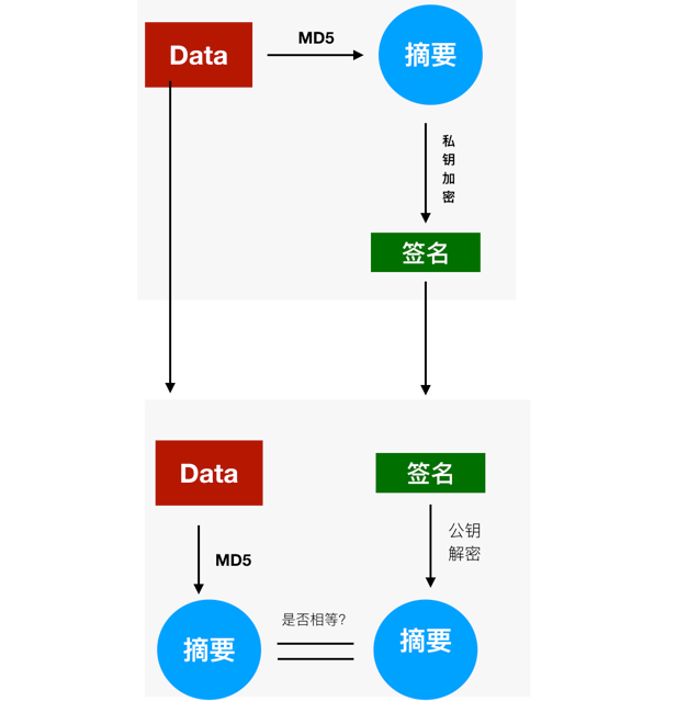 前边我们提到了数字签名的过程,只需要一对公私钥就可以实现如下图的签名流程