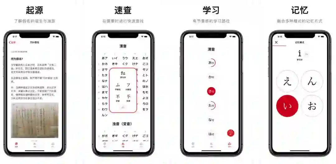 五十音图教学应用一抓一大把,没点特色还真不好意思拿出来说。50 音起源颇有些「知其然,还要知其所以然」的意思,一打开应用,出现的不是枯燥的音图,而是四段科普文,它们简单介绍了日本文字的起源演变,以及一些语言专用术语的释义,为你的日语学习打下一定的理论基础。