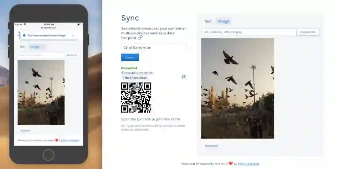 Sync 是个人开发者的业余作品,可以在多设备上无缝广播内容。简单来说,当使用同一授权码连接之后,Sync 能跨设备同步显示文本和图片内容。