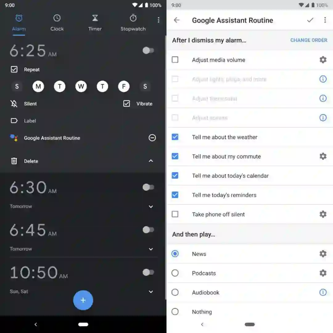 在 Google Clock 应用中点击展开某个闹钟,即可在详情界面底部看见这个新加入的 Google Assistant Routine 入口,通过 Google Assistant Routine,我们可以为关闭闹钟这个操作设置多种多样的后续路径,包括调节媒体音量,控制智能家居,播报天气、交通状况、提醒、日历事项以及关闭静音模式等等,随后还能播放新闻、博客或有声电子书。所有路径操作的顺序都能根据实际需求进行手动调整。