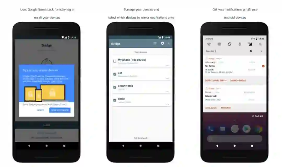 而如果你的常用设备都是 Android,或者有在多台 Android 设备间同步接收通知的需求,最近出现的这款 Bridge 相比之下是个更加轻量的选择。