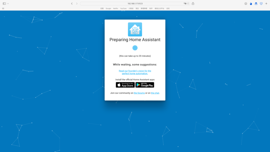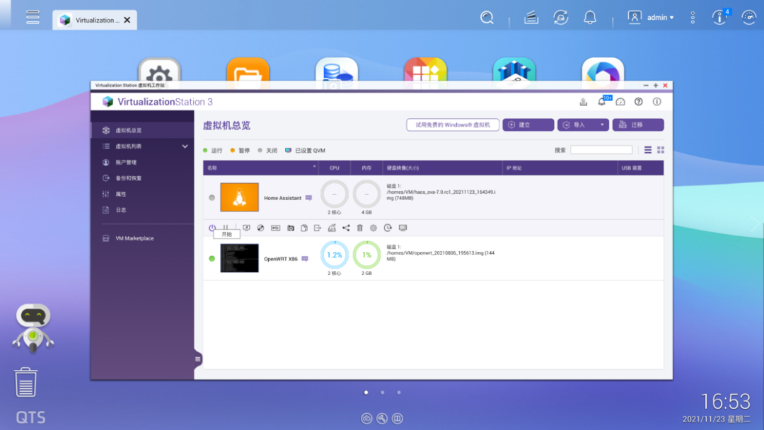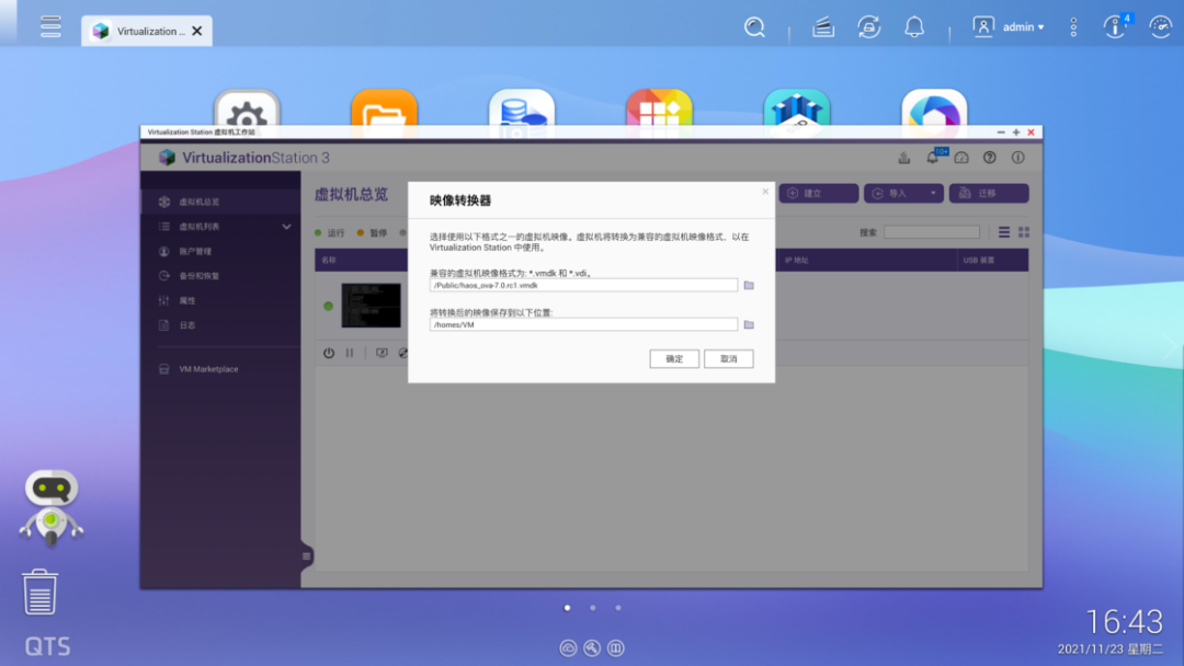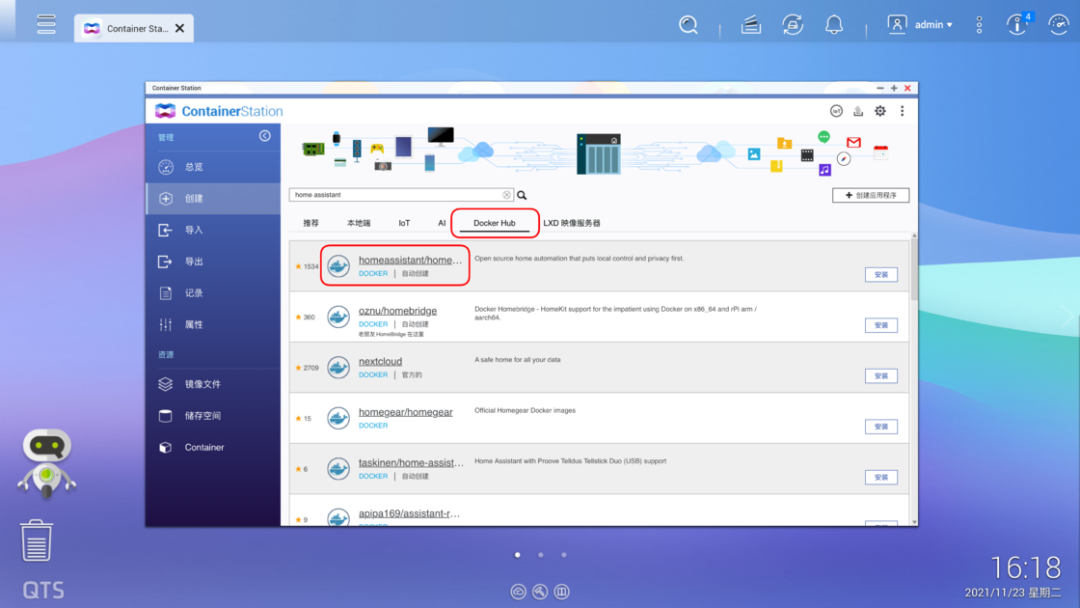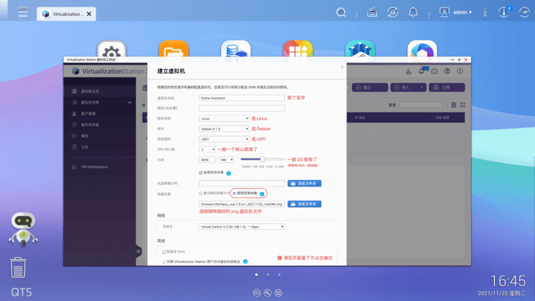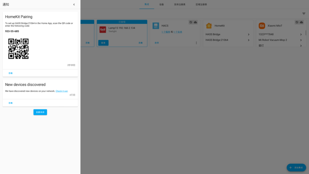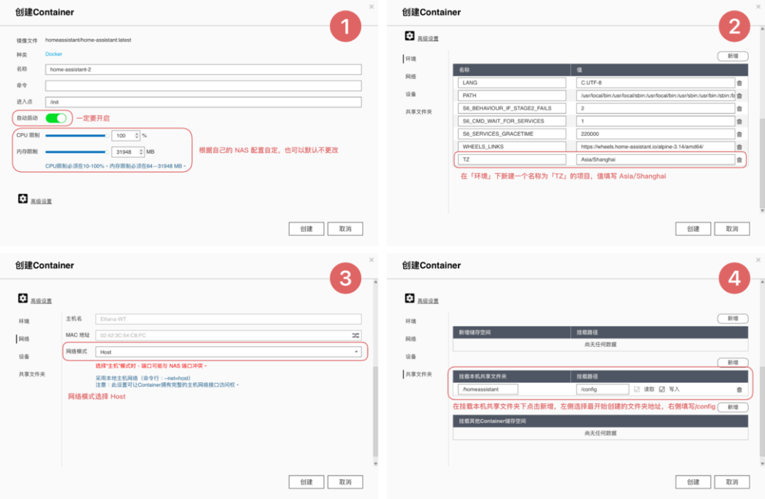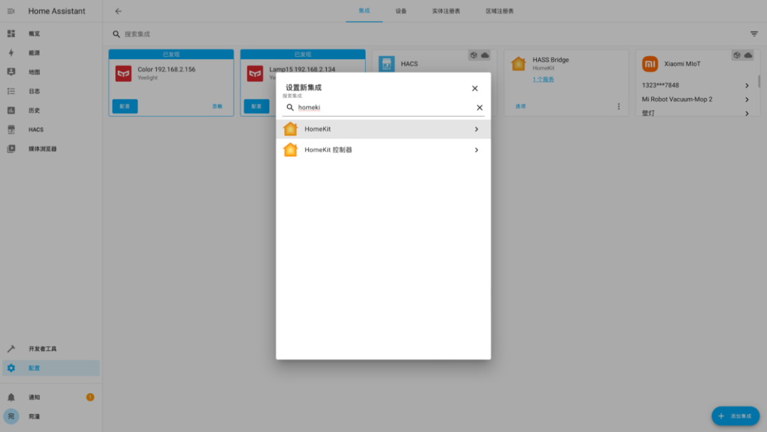 https://github.com/home-assistant/operating-system/releases/download/7.0.rc1/haos_rpi3-64-7.0.rc1.img.xz注意刷写的目标磁盘不要选错刷写完成后,将树莓派接上电源和网线,启动完成后在电脑的浏览器中输入 homeassistant.local:8123,即可进入到 Home Assistant 后台管理界面。对于方案二,操作就更加简单了。由于我目前使用的是 NAS 品牌是威联通 NAS,因此后面也将用它来举例,其他品牌的 NAS 可以自行查找对应的资料。首先是通过 Docker 来安装的方式。登陆到 NAS 后台后,在存储池的任意一个位置新建 homeassistant 共享文件夹,用于存储 Home Assistant 所产生的配置文件。例如我是直接建立在存储池的根目录下接着,打开 Container Station,然后点击左侧的创建,搜索 Home Assistant,选择「Docker Hub」下的第一个搜索结果,点击安装。然后,选择最新版本的映像,并按照下面的参数来进行设定。设定完成后,点击确认安装,并等待安装完成。完成后,在电脑浏览器中输入你的 NAS IP 地址:8123,就可以登陆到 Home Assistant 后台管理页面。而通过虚拟机来安装,则需要先下载 Home Assistant 的虚拟机镜像。首先到这里下载最新的 vmdk 虚拟机文件,然后解压后上传到 NAS 任意一个文件夹中。由于 NAS 中的虚拟机文件为 img 格式,因此在运行之前,我们需要进行一步转换操作。打开 Virtualization Station,然后点击「导入 - 映像转换器」,选择你上传的 vmdk 文件和转换后的保存位置,点击确定并等待一段时间即可。完成之后,我们就可以开始建立虚拟机了。同样是在 Virtualization Station 中,点击「建立」,然后按照下面的图片来进行设置。需要注意的是,启动固件一定要选择 UEFI,否则必然出错。这样我们就成功创建了一个 Home Assistant 虚拟机。在虚拟接列表中点击开始,然后打开远程桌面,等到界面中显示了 ha > 即表示启动完成。回到虚拟机列表后,就可以找到 Home Assistant 的 IP 地址,在浏览器中输入这个 IP 地址,然后加上 :8123 ,就能进入到 Home Assistant 后台管理界面了。不过,通过虚拟机安装的 Home Assistant 首次启动需要等待大概 20 分钟或更长需要注意的是,通过 Docker 方案安装的 HomeAssistant 是没有 Supervisor 的(你可以理解为官方提供的一个插件库)。如果你只是为了和我一样只是单纯地想将米家的设备接入到 HomeKit,不打算使用 HomeAssistant 的其它功能,那么可以采用这个方案。否则,我强烈建议使用树莓派来刷写 HomeAssistant 的官方系统,或是用虚拟机来安装。无论是何种方案,耗费的时长都不一定相同,且首次启动 Home Assistant 也需要较长时间。在这之中影响的因素包括机器性能、硬盘速度和网络环境。如果某一步卡住了,可以耐心等待一段时间,或是试试万能的重启 / 重头再来操作。现在,我们安装好了 Home Assistant,其实就已经完成了最难的一步,接下来的操作,就非常简单了。