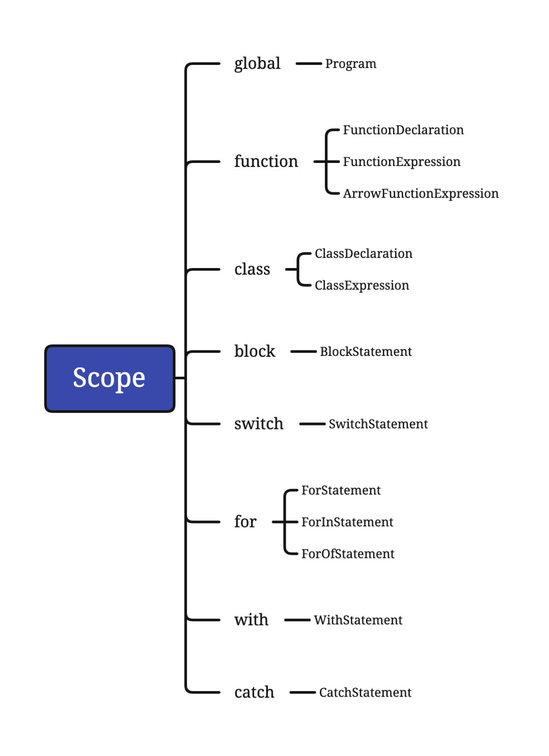 BlockStatement: enterScope,            "BlockStatement:exit": exitScope,            ForStatement: enterScope,            "ForStatement:exit": exitScope,            ForInStatement: enterScope,            "ForInStatement:exit": exitScope,            ForOfStatement: enterScope,            "ForOfStatement:exit": exitScope,            SwitchStatement: enterScope,            "SwitchStatement:exit": exitScope,            CatchClause: enterScope,            "CatchClause:exit": exitScope,            StaticBlock: enterScope,            "StaticBlock:exit": exitScope,