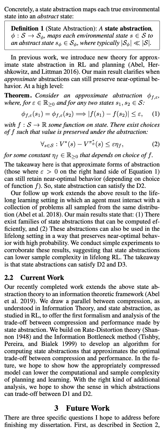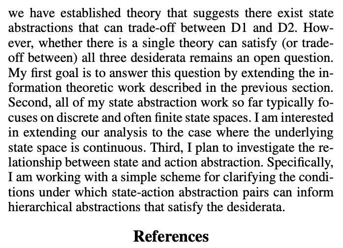 My interest in this question stems from its foundational role in many aspects of learning and decision making: agents can’t model everything in their environment, but must necessarily pick up on something about their surroundings in order to explore, plan far into the future, generalize, solve credit assignment, communicate, and efficiently solve problems. Abstraction is essential to all of these endeavors: through abstraction, agents can construct models of both their surroundings and behavior that are compressed and useful. The