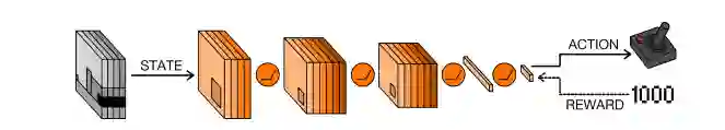我们对基于价值函数的DRL算法的讨论,从深度Q网络(如下图所示)开始,该算法在经典Atari 2600视频游戏中获得了普遍的成功,性能堪比专业的视频游戏测试人员。DQN的输入是游戏的四个灰度帧,随着时间的推移连接,最初由几个卷积层处理,以便提取时空特征,例如“Pong”或“Breakout”中球的移动。最终,来自卷积层的特征图由几个全连接的层来处理,这更多隐含编码地动作的效果。这与使用固定预处理步骤的更传统的控制器形成对照,因此,它们不能适应其对学习信号的状态处理。