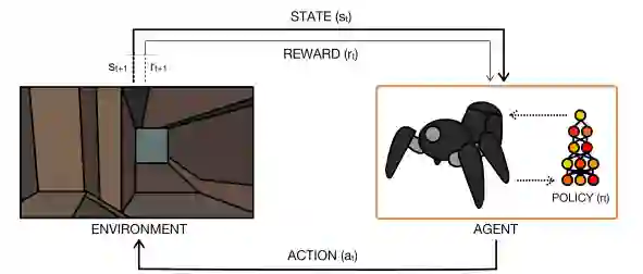 在RL设置中,由机器学习算法控制的自主智能体在时间步长t观察其环境中的状态st。当智能体采取动作时,环境和智能体将根据当前状态和所选动作转换到新状态st+1。状态是一个足够静态的环境,包括了智能体采取最佳行动的所有必要信息。行动的最佳顺序由环境提供的奖励决定。每当环境转变到新的状态时,它还会向智能体提供一个标量奖励值+ 1作为反馈。智能体的目标是学习最大限度地提高预期收益(累积、贴现奖励)的策略(控制策略)π。给定一个状态,一个策略返回一个执行动作;最优策略是使环境中预期回报最大化的任何策略。在这方面,RL旨在解决与最佳控制相同的问题。然而,RL中的挑战是智能体需要通过反复试验了解环境中行为的后果,因为与最优控制不同,智能体不能使用状态转换动态模型。与环境的每一次互动都会产生信息,智能体用它来更新其知识,这种感知-行动-学习循环在下图中展示了出来。