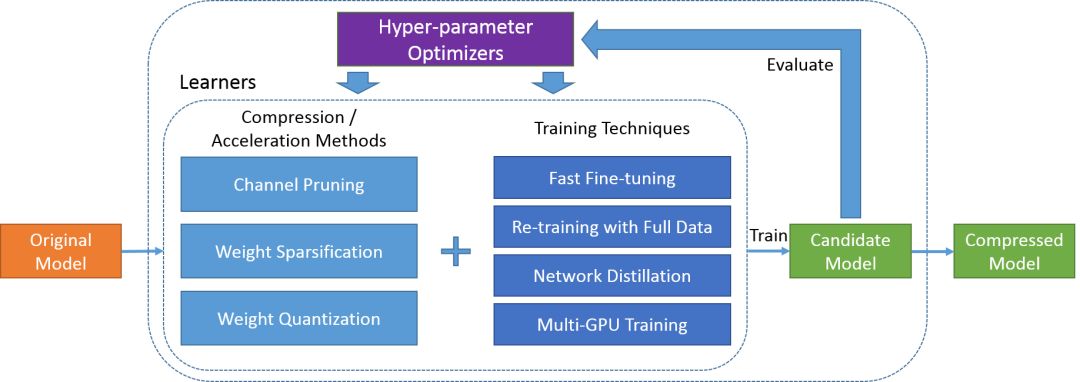 鹅厂开源的深度学习模型压缩工具。开发者只需指定所需压缩率,PocketFlow就能自动选择恰当的超参数,生成高效的压缩模型。PocketFlow的内部机制是根据原始模型(未压缩模型),使用随机选择的一些超参数组合生成候选模型,再通过超参数优化器选出最佳模型。PocketFlow通过微调或全数据重训恢复压缩模型的表现。