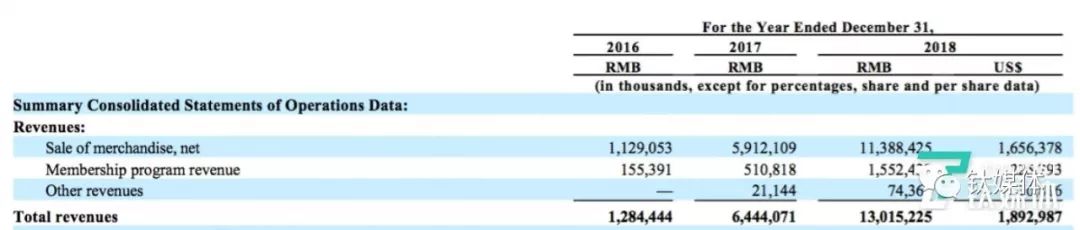 从2016年到2018年,云集的总收入为分别为12.84亿元、64.44亿元、130.15亿元。其中,商品销售收入分别为11.29亿元、59.12亿元、113.88亿元;会员收入为1.55亿元、5.11亿元,15.52亿元。2018年,会员收入占到总体收入的13.6%。