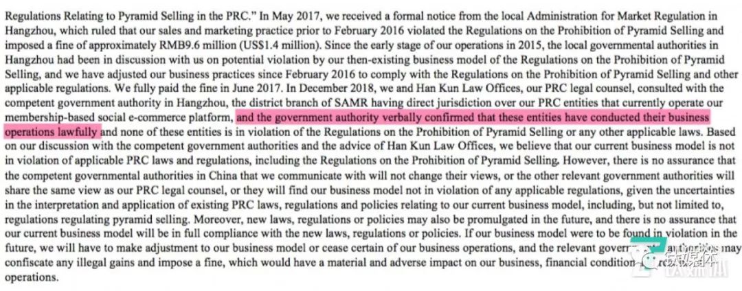 云集认为目前的商业模式并不违反相关法律法规, 包括禁止传销的规定,但同时也在招股书中也坦言,目前与监管部门的沟通也不能确保改变他们的意见。