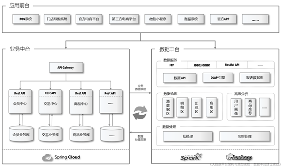 这是一张混合了技术和业务的中台逻辑架构示意图,前台应用部分我们将零售和消费品行业需要对接消费者的若干应用系统一一列举了出来,但是在中台架构下它们已经和传统的“应用系统”有了很大的差别,变得非常“轻量”。过去很多自行实现的业务功能都通过调用业务中台的各个业务中心完成了,如前面列举的会员注册功能,在中台架构下都是调用会员中心上的统一接口完成的。与此同时,各业务中心的数据都将通过数据中台上的数据采集组件采集到大数据平台上,然后通过批处理和实时处理机制构建出企业的数仓体系和高级数据分析能力,最后通过构建数据API (Web 服务)、OLAP 及专有的报表数据库等手段,将结果数据以Restful API、JDBC/ODBC 或FTP 等形式提供给外部使用。