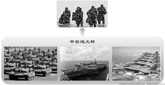 图1 是《企业IT 架构转型之道:阿里巴巴中台战略思想与架构实战》一书中给出的关于中台战略非常形象的描述。这张图描述的是美军现行的作战模式,在一线战场,美军通常以班为单位组织军事行动,这种极小型团队行动敏捷,容易捕获战机,一旦发现敌情就通过指挥系统呼叫强大的炮火和空中支援给敌军以重创。美军的这种战场组织阵型与中台架构的思想是一致的,战斗小组就是“小前台”,强大的炮火群和空中力量是“大中台”。在强大中台的有力支撑下,前端在进行业务运营和创新时会变得非常高效且灵活,企业可以根据最新的市场动态展开各种尝试和调整,一旦发现并验证了新的市场机遇,就可以调集中台的强大能力迅速跟进,抢占市场。