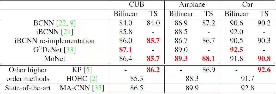 表 4:细粒度分类上的实验结果。双线性和 TS 分别表征全双线性池化和 Tensor Sketch 紧密池化。每栏中的最佳表现标为红色。