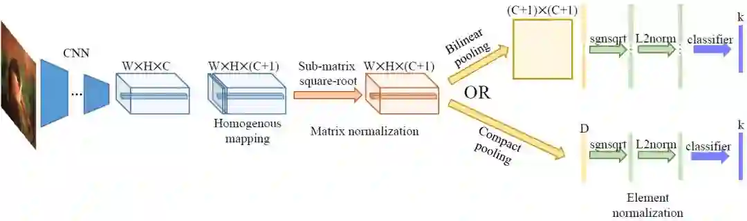 近期双线性池化作为一种特征编码层被提出,可在深度网络的卷积层之后使用,提升在多个视觉任务中的表现。与传统的全局平均池化层或全连接层相比,双线性池化以平移不变式的形式收集二阶信息。但是,这一池化层家族的一个严重弊端是其维度爆炸。为解决这一问题,已探索了紧密的近似池化方法。另外,最近成果表明,通过矩阵归一化来调整不稳定的较高阶信息可获得显著的性能提升。然而,紧密池化与矩阵归一化的结合至今未被探索。