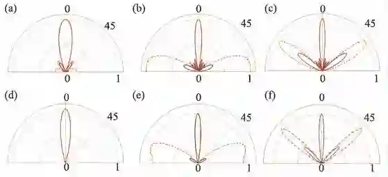图4(a),(b),(c)显示了偶极阵列(实线)和单极子线阵(虚线)的方向性函数的理论结果;图4(d),(e),(f)偶极阵列(周期性HR)和单极子线阵阵列(无周期性HR)的指向性的有限元仿真结果。这些结果表明,出现在单极子阵列中的次极大值可以为零,并且其他角度的次极大值可以在偶极子阵列中被削弱。换句话说,出现在单极子阵列中的次极大值可以被削弱或者甚至消除。因此,偶极阵列在更宽的频率范围内具有更好的方向性,并且具有比单极子阵列更小的旁瓣。