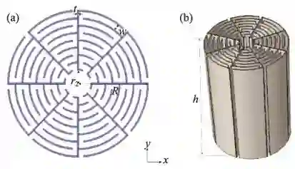 二维米氏(Mie)共振结构单元如图5(a)所示,图5(b)为三维圆柱体Mie 共振单元。二维Mie 共振结构按角度分为8 块完全相同的部分,蓝色部分是厚度为t 的固体材料构成的墙,背景介质为空气。将这些多分支的墙插入空气中就产生了宽度为w的Z 字型空气通道,由于固体墙可近似为硬边界,所有空气中的声波被强制沿着曲折的Z 字通道传播,这样就延长了声波从结构外部传入结构内部的路径,而空气中的声速不会变化,因此传播时间也就相应的变长了。整个结构的外半径为R,内部空心处的半径为r2 ,均远小于波长。由于Mie 结构的尺寸远小于波长,因此在长波近似下等效地看来,距离不变时间变长,声波从外部传到内部的等效速度就变慢了,由此,将Mie 结构视为一个整体就得到了等效折射系数远大于空气的超慢流速材料。
