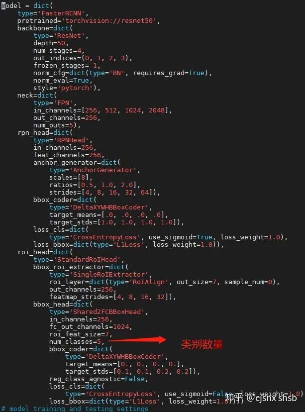 打开 faster_rcnn_r50fpn.py 文件 ,修改num_classes 数量,num_classes 的值等于类别数量,不需要加背景了