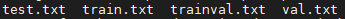 三个.txt文件里面分别是训练测试图片名称的索引,数据集准备到这就完成了