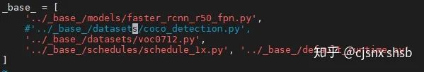 faster_rcnn_r50_fpn_1xcoco.py文件里面调用了三个文件,第一个是模型配置文件,第二个是数据集配置文件,后来两个是配置学习率,迭代次数,模型加载路径等等,我们把原来COCO_detection.py 修改成VOC0712.py 文件