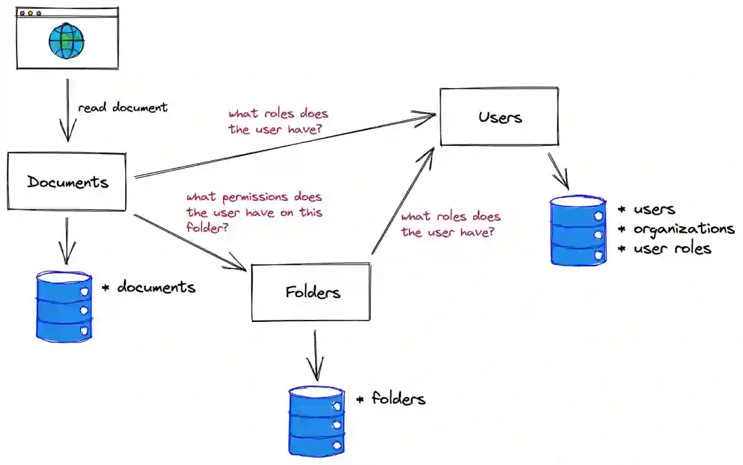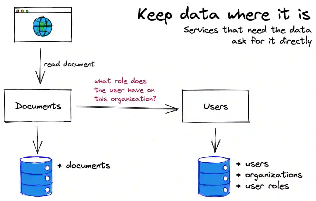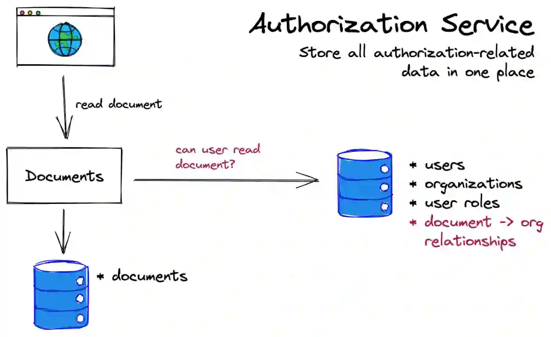 当你将应用程序拆分为不同的服务时,会发生什么情况?也许你已经剥离了一个新的“文档服务”——现在,检查特定文档的读权限需要检查位于该服务数据库之外的用户角色。文档服务如何访问它所需要的角色数据?