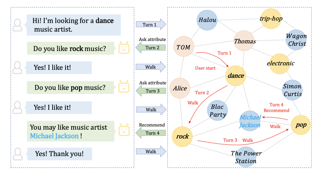 不妨从日常生活的情节进行考虑。当我们想找朋友一起看电影,可能先会询问对方心情如何或者有没有看电影的意愿;在获得了肯定的答复后,我们可能会试探性地提供一个正在热映的电影;如果对方恰好不喜欢这类影片,我们可能会根据标签排除这类候选项;接着继续进行询问和推荐,直到我们达成共识。