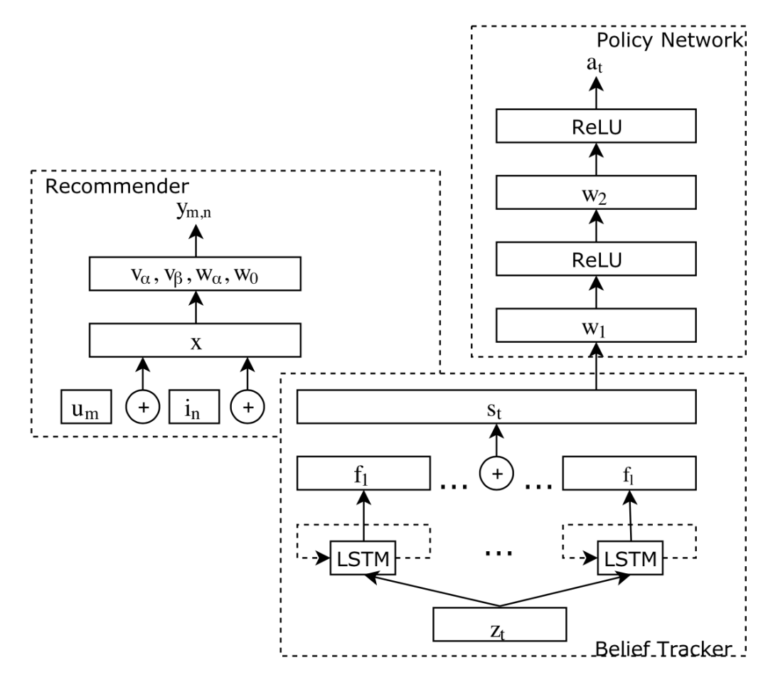 最后是策略模块,CRM 以用户置信 作为输入,经过简单的两层前馈神经网络直接得到了用户的动作预测。三个模块构成的对话推荐系统架构如下图所示。