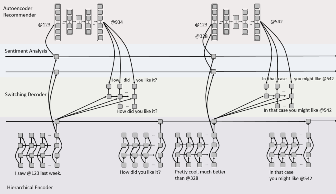 本文所提出模型的整体架构如上图所示。在对话模块一侧,使用了层次化的 RNN 架构 HRED 来编码对话,并采用了预训练的 Gensen 句子向量表示。HRED 得到对话的隐含向量表示之后,一方面会给情感分析 RNN 进行计算,一方面给 Switching Decoder 来将推荐结果融入到对话中,另外还能用于给 RNN 解码出回复语句。而在推荐模块一侧,模型采用了降噪自编码器,同时利用了情感分析模块的计算结果进一步修正推荐结果。训练时,推荐模块先在电影评分数据集 MovieLens 上进行预训练,而后才在 REDIAL 上进一步训练。