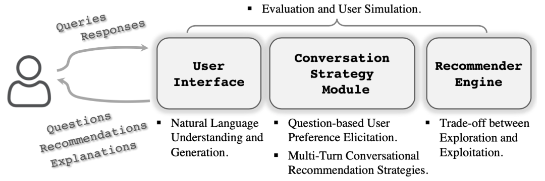 本文认为多轮推荐场景的实施,需要对话推荐系统的两大模块(对话模块 Conversational Component,CC;推荐模块 Recommender Component)的深入交互,而这种交互主要有下面三个基本问题: