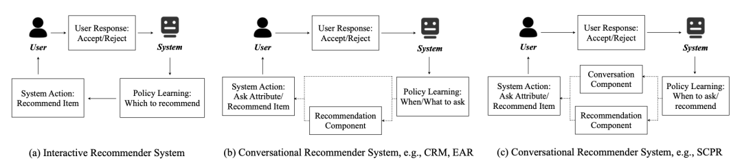 如果在对话的过程中系统能够进行多次推荐,直到用户采纳推荐结果或者离开,我们称这种场景为多轮的(multi-round)。相对地,如果系统仅进行一次推荐,而不关注用户是否接受该结果,则称为单轮的(single-round)。