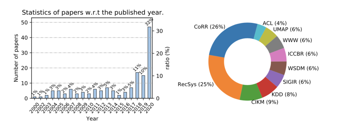 综述文章 [1] 以Conversation* Recommend*为关键词在 DBLP 上搜索了相关工作并作统计,得到了相关论文按年份和按会议的分布数据。从图中可以发现在 2018 年来该领域出现了更多的相关工作,而正是在 2018 年发表的两篇代表性工作,成为对话推荐系统两个类别最常见的基准模型(baseline)。