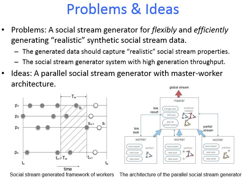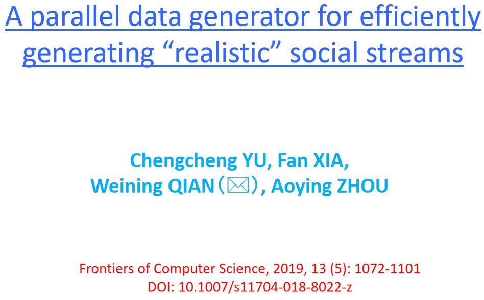 社交流数据指记录了社交实体状态及实体间关系动态变化的数据流。它可以用来表示大量应用中的实体状态变化。由于社交流数据是图数据和流数据的结合,因此对于分析型查询处理、用户行为理解等工作提出了更高的挑战。出于对隐私、数据量庞大不易转移等问题的考虑,一个社交流数据生成器具有重要的意义。本文提出了一个合成社交流数据生成器SSG,使用SSG产生的社交流数据能够与真实数据的多项社交流数据属性相一致,包括基础的用户行为属性和图属性。本文使用多个真实社交流数据进行实验,实验表明SSG能够很好的拟合真实数据,并且能够以稳定的吞吐量和内存消耗来持续的产生社交流数据。此外,本文采用异步模型和延迟更新策略等技术设计并实现了SSG的分布式版本。实验表明,分布式SSG产生数据的吞吐量能够随着节点的增加而呈线性增长。