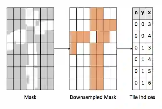 图 2:为了利用 CNN 激活中的稀疏性,SBNet 首先将计算掩码转换成 tile 索引列表