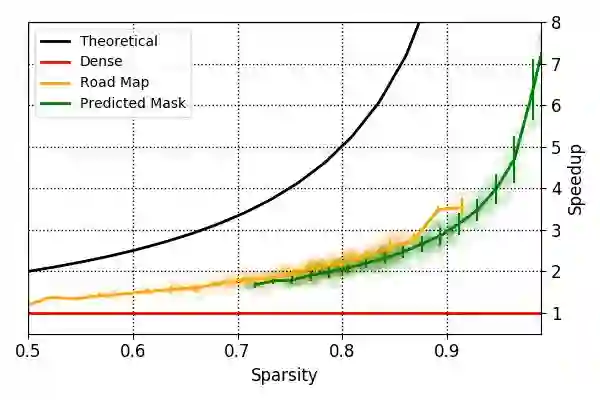 使用道路地图的变体平均有 80% 的稀疏度,对应实现了 2 倍的加速;使用预测掩码的变体平均有大约 90% 的稀疏度,对应实现了 3 倍的加速.