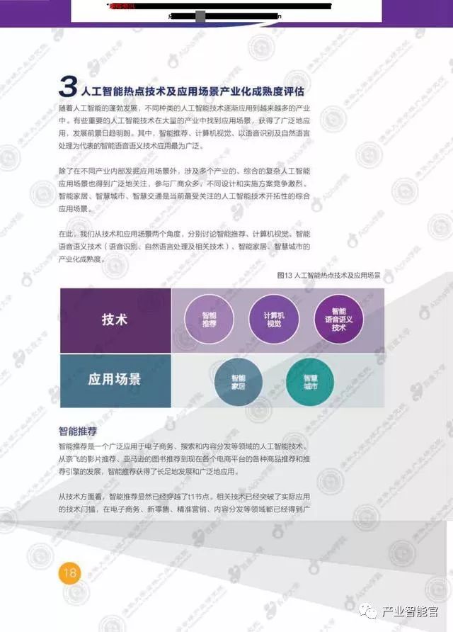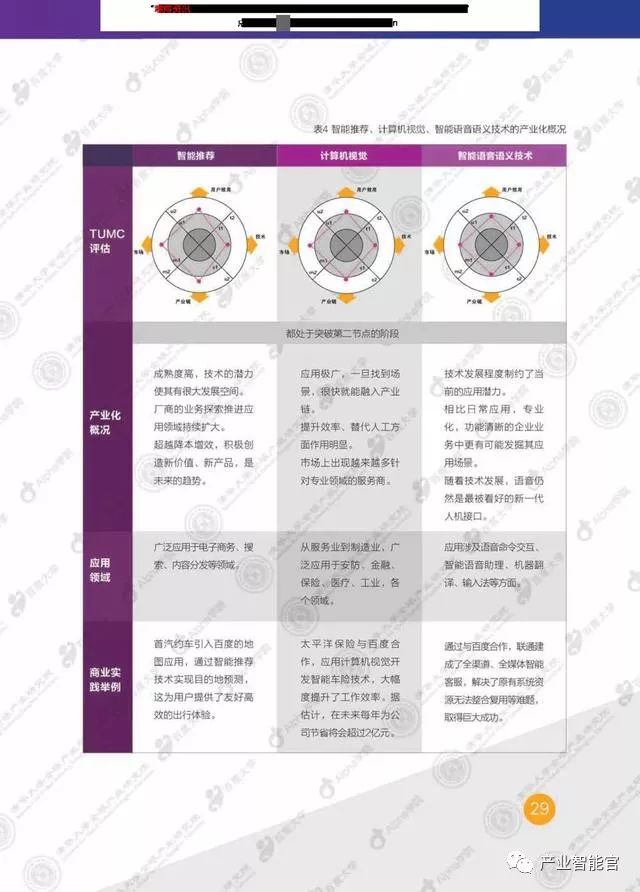 本研究分两大部分,第一部分讨论了人工智能的发展情况,并应用TUMC模型从技术和综合应用场景的角度考察了热点技术和场景的人工智能产业化成熟度。第二部分,通过企业的具体实践,分析了智能推荐、计算机视觉、智能语音语义技术等人工智能技术在智慧岀行、智能家居、智慧堿市、智能客服等实际应用场景中的产业化发展情况。这些商业实践基本覆盖了当前最重要的人工智能技术和综合应用场景。